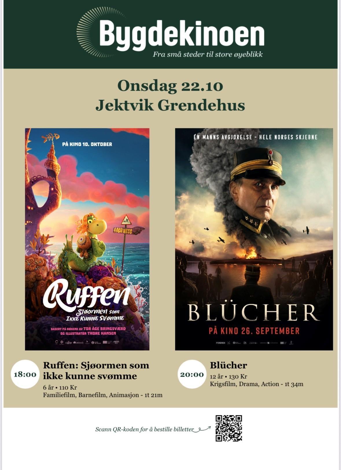 Onsdag 22.  oktober viser Bygdekinoen filmene «Ruffen: Sjøormen som ikke kunne svømme» kl. 18:00 og «Blücher» kl. 20:00.