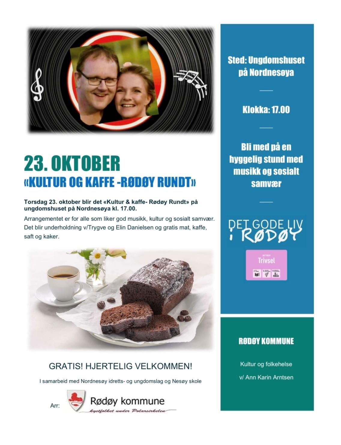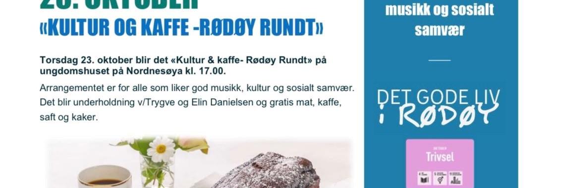 Torsdag 23. oktober kl. 17.00 inviterer vi til "Kultur og kaffe – Rødøy Rundt" på ungdomshuset på Nordnesøy. Det blir underholdning, hyggelig samvær og gratis servering av varm mat, kaffe, saft og kaker 🎶☕ – et lavterskeltilbud for trivsel og fellesskap, åpent for alle! 💚