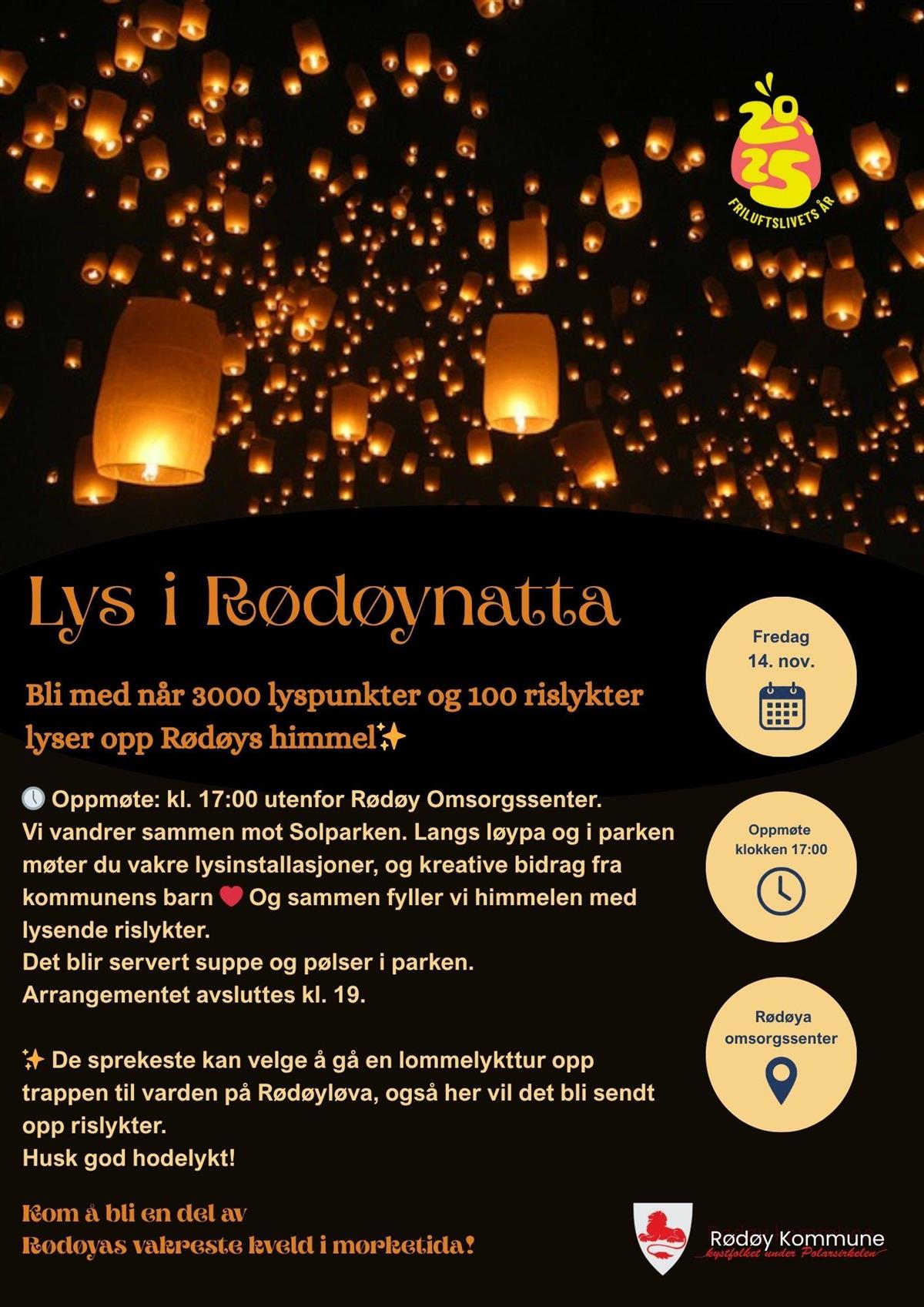 I forbindelse med friluftslivets år inviteres alle kommunens innbyggere til “Lys i Rødøynatta” - en stemninsfull lysfest på Rødøya fredag 14. november klokka 17.00.