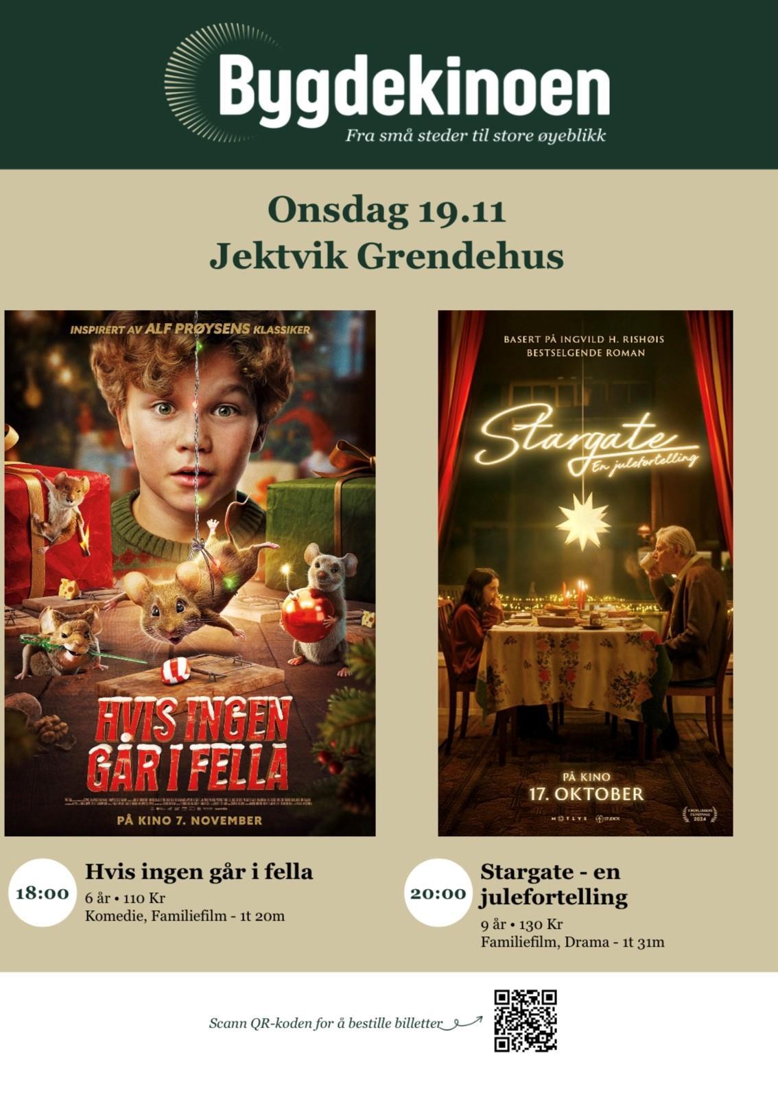 Onsdag 19.  november viser Bygdekinoen filmene «Hvis ingen går i fella» kl. 18:00 og «Stargate - en julefortelling» kl. 20:00.
