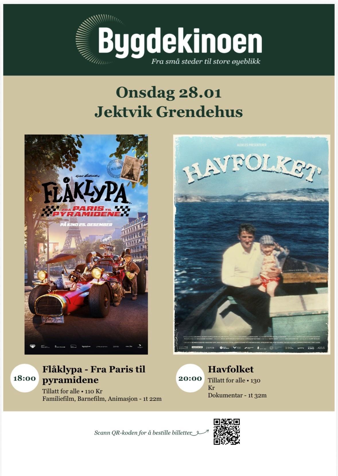 Onsdag 28. januar viser Bygdekinoen filmene «Flåklypa- Fra Paris til Pyramidene» kl. 18:00 og «Havfolket» kl. 20:00.