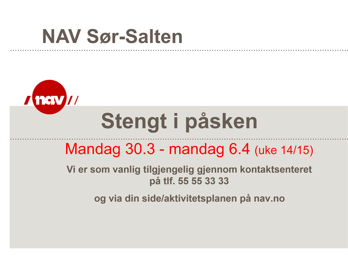 Nav Sør-Salten har personell på jobb for å håndtere nødhjelp/post i uke 14. Kritiske brukerhenvendelser skal skje via NAV Kontaktsenter på tlf 55 55 33 33, som har oversikten over hvem som er på jobb til enhver tid utfra hva henvendelsen gjelder.