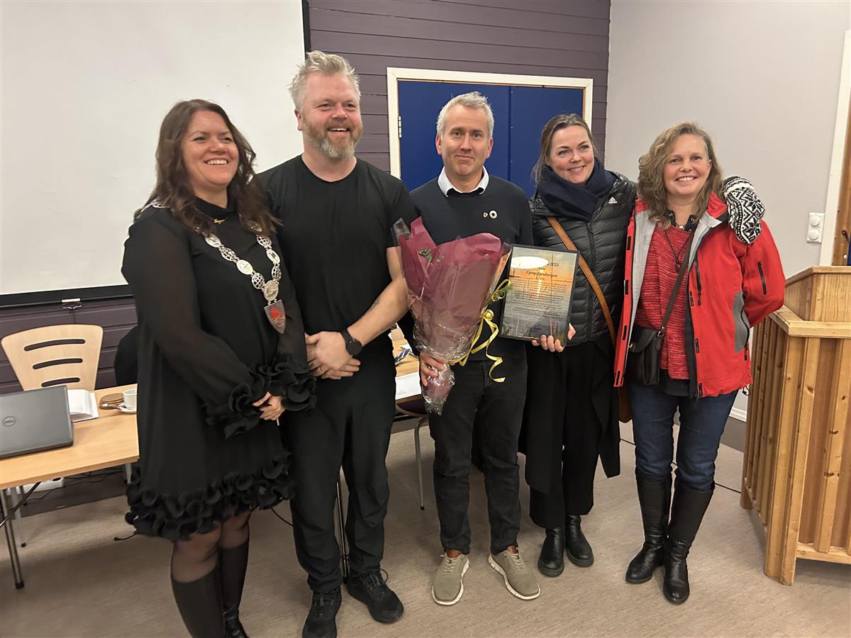 Prisen ble overrakt av ordfører Inger Monsen. På bildet fra venstre: Ordfører Inger Monsen, Yngve Krogh Engen, Frank Heimdal (leder Tjongsfjordrevyen), Silje Victoria Engen og Elisabeth Sjåvik Monsen.